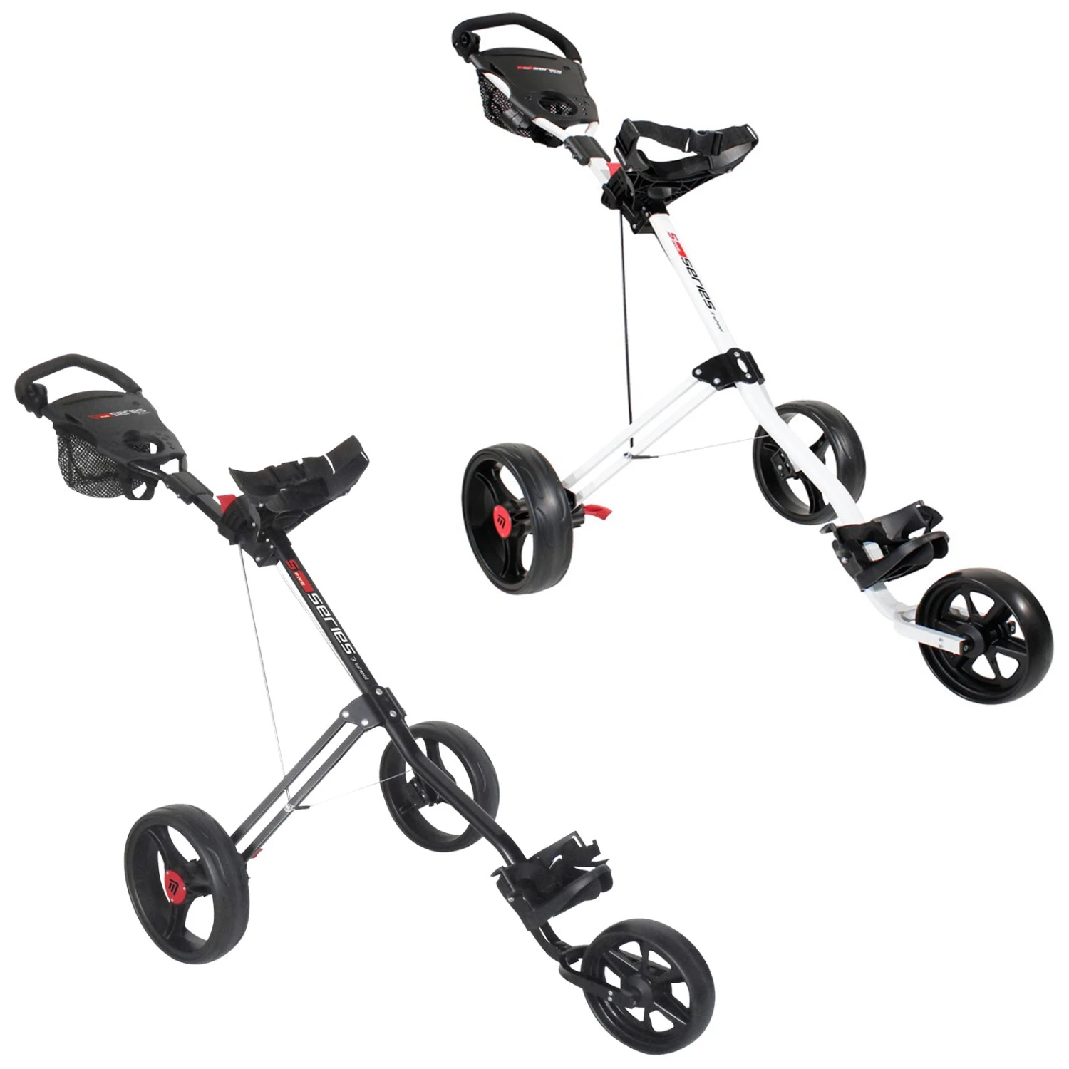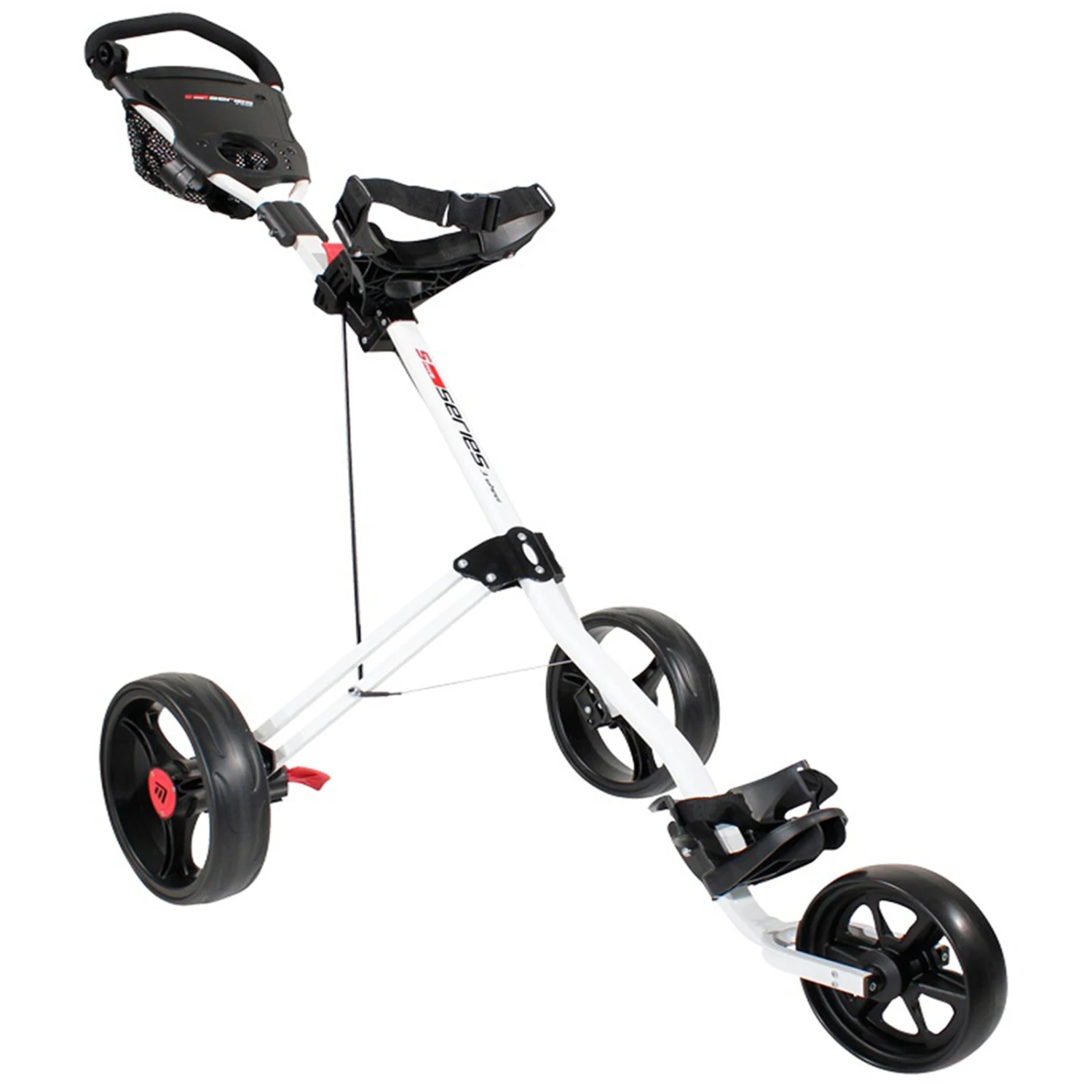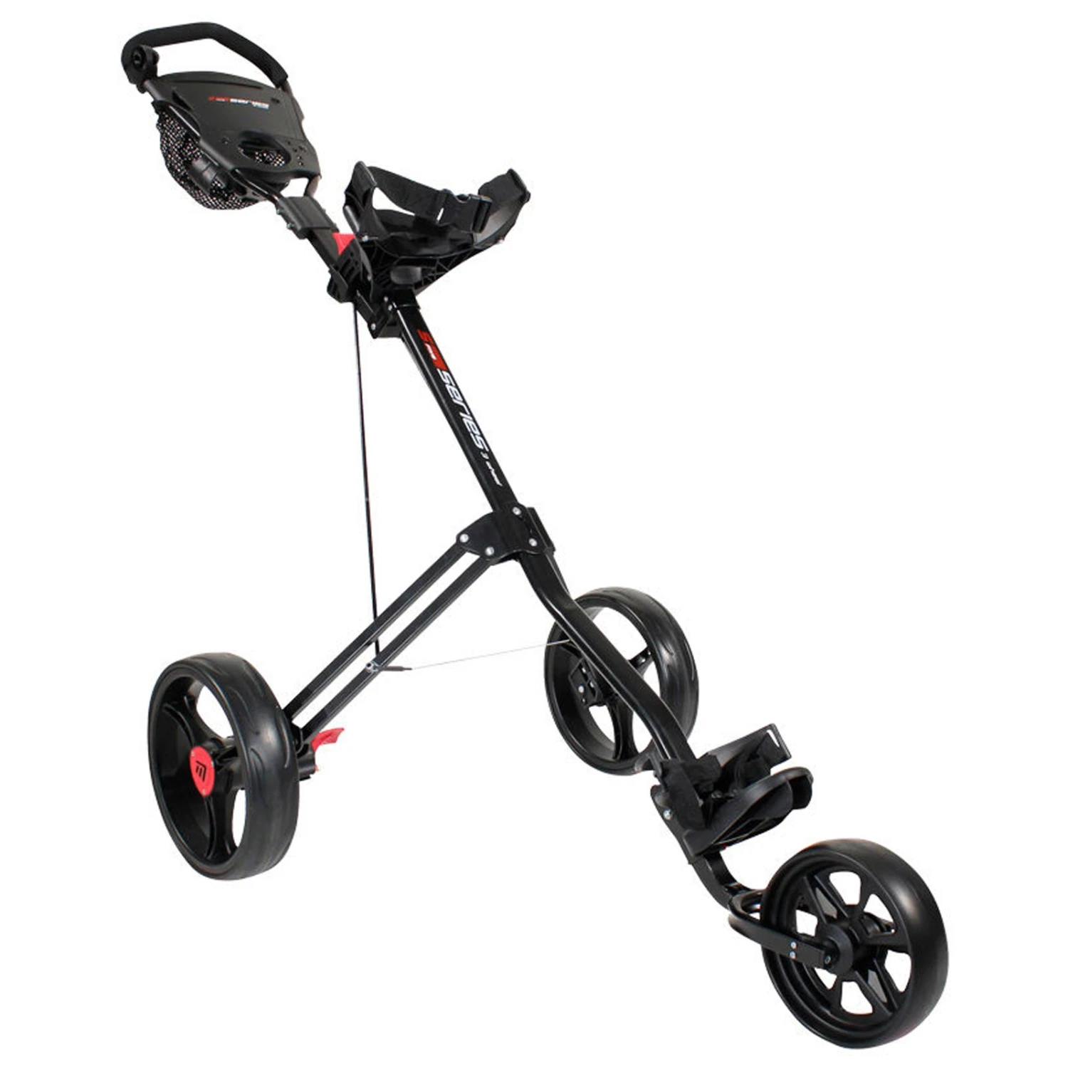 The 5 Series 3 Wheel Push Cart is a 3 wheel golf cart with a sturdy frame and high load capacity. The fantastic design of this 3 wheel trolley allows you to carry everything you need with quick access when you need it. It has storage options for a scorecard holder, tees, balls, pencils, small accessories and keys. This trolley is very easy to store away, thanks to its compact shape when folded down (89 x 39 x 34 cm). Completing the design is a drinks holder so you can get quick refreshments while playing. It can support the shape and weight of any golf cart bag and glide easily over almost any terrain.
